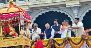Read More »ಗಜಪಡೆಯ ಕ್ಯಾಪ್ಟನ್ ಅಭಿಮನ್ಯುವಿನ ಮೇಲೆ ಚಿನ್ನದ ಅಂಬಾರಿಯಲ್ಲಿ ವಿರಾಜಮಾನಳಾಗಿರುವ ತಾಯಿ ಚಾಮುಂಡೇಶ್ವರಿಗೆ ಗಣ್ಯರು ಪುಷ್ಪಾರ್ಚನೆ ಮಾಡಿದರು.