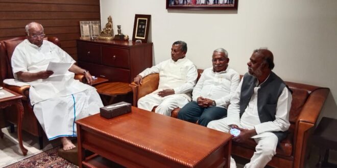 ಬೆಂಗಳೂರು: ಎಐಸಿಸಿ ಅಧ್ಯಕ್ಷರಾದ ಮಲ್ಲಿಕಾರ್ಜುನ ಖರ್ಗೆ ರವರನ್ನು ಇಂದು ಮಾನ್ಯ ಆಹಾರ ಸಚಿವರಾದ ಕೆಹೆಚ್. ಮುನಿಯಪ್ಪ ಹಾಗೂ ಅಬಕಾರಿ ಸಚಿವರಾದ ಆರ್.ಬಿ.ತಿಮ್ಮಾಪುರ ರವರ ನೇತೃತ್ವದಲ್ಲಿ ಸಮುದಾಯದ ಶಾಸಕರು ಮಾಜಿ ಸಚಿವರು ಹಾಗೂ ಮಾಜಿ ಸಂಸದರು ಭೇಟಿ ಮಾಡಿ, ನೇಮಕಾತಿಯಲ್ಲಿ ಒಳ ಮೀಸಲಾತಿ ಅನುಷ್ಠಾನ ಮಾಡುವ ಕುರಿತು ಚರ್ಚಿಸಿದರು.