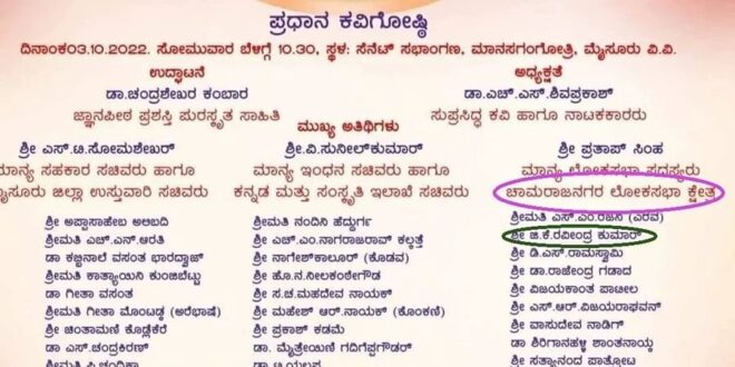ಮೈಸೂರು: ನಾಡಹಬ್ಬ ದಸರಾದ ಪ್ರಧಾನ ಕವಿಗೋಷ್ಠಿಯ ಆಹ್ವಾನ ಪತ್ರಿಕೆಯಲ್ಲಿ ನಿಧನರಾದವರ ಹೆಸರನ್ನು ಪ್ರಕಟಿಸಿ ಕನ್ನಡ ಮತ್ತು ಸಂಸ್ಕೃತಿ ಇಲಾಖೆ ಎಡವಟ್ಟು ಮಾಡಿಕೊಂಡಿದೆ. ಪ್ರಧಾನ ಕವಿಗೋಷ್ಟಿಯಲ್ಲಿ ರಾಜಕೀಯ ಮುಖಂಡರು ಭಾಗವಹಿಸಲಿದ್ದು, ನಿಧನರಾದ ಆಕಾಶವಾಣಿ ನಿಲಯ ನಿರ್ದೇಶಕ ಜಿ.ಕೆ ರವೀಂದ್ರ ಕುಮಾರ್ ಅವರ ಹೆಸರು ಆಹ್ವಾನ ಪತ್ರಿಕೆಯಲ್ಲಿದೆ.