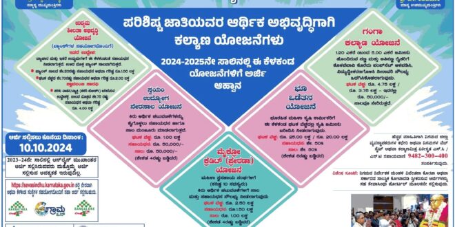 ಬೆಂಗಳೂರು : ರಾಜ್ಯ ಸರ್ಕಾರವು ಪರಿಶಿಷ್ಟ ಜಾತಿಯವರ ಆರ್ಥಿಕ ಅಭಿವೃದ್ಧಿಗಾಗಿ ಕಲ್ಯಾಣ ಯೋಜನೆಗಳನ್ನು ಹಾಕಿಕೊಂಡಿದೆ. 2024-25ನೇ ಸಾಲಿನಲ್ಲಿ ಈ ಯೋಜನೆಗಳಿಗೆ ಅರ್ಜಿ ಅಹ್ವಾನಿಸಿದೆ.