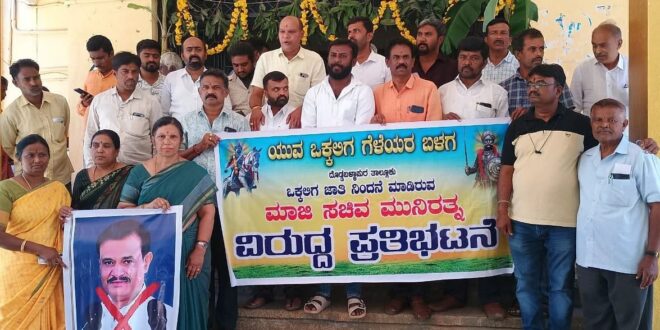 ಬೆಂಗಳೂರಿನ ಬಿಬಿಎಂಪಿ ವ್ಯಾಪ್ತಿಯ ಒಕ್ಕಲಿಗ ಜನಾಂಗದ ಗುತ್ತಿಗೆದಾರರೊಬ್ಬರನ್ನು ಶಾಸಕ ಮುನಿರತ್ನಂ ನಾಯ್ಡು ಅವಾಚ್ಯ ಶಬ್ದಗಳಿಂದ ನಿಂದಿಸಿದ್ದಲ್ಲದೆ, ತುಚ್ಛವಾಗಿ ಮಾತನಾಡಿ ಗುತ್ತಿಗೆದಾರರನ್ನು ಹೆದರಿಸಿ, ಜೀವ ಬೆದರಿಕೆ ಒಡ್ಡಿದ್ದಾರೆ ಎಂದು ಪ್ರತಿಭಟನನಿರತರು ದೂರಿದರು.