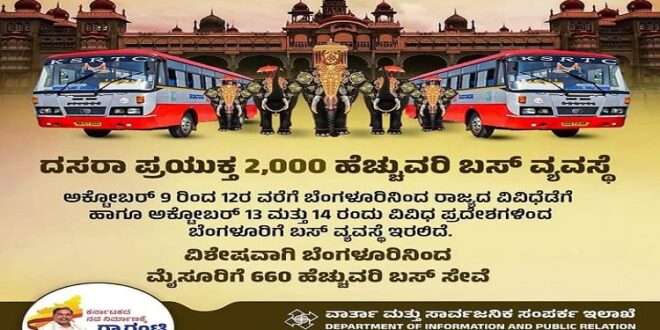 660 ವಿಶೇಷ ಬಸ್: ಬೆಂಗಳೂರಿನ ಮೈಸೂರು ರಸ್ತೆ ಬಸ್ ನಿಲ್ದಾಣದಿಂದ ಮೈಸೂರಿಗೆ ಪ್ರತ್ಯೇಕವಾಗಿ 260 ಹೆಚ್ಚುವರಿ ವಾಹನಗಳ ಕಾರ್ಯಾಚರಣೆ ಇರಲಿದೆ. ಮೈಸೂರಿನ ಸುತ್ತಮುತ್ತಲಿನ ಪ್ರೇಕ್ಷಣೀಯ, ಧಾರ್ಮಿಕ ಹಾಗೂ ಪ್ರವಾಸಿ ತಾಣಗಳಾದ ಚಾಮುಂಡಿ ಬೆಟ್ಟ, ಕೆ.ಆರ್.ಎಸ್. ಅಣೆಕಟ್ಟು, ಶ್ರೀರಂಗಪಟ್ಟಣ, ನಂಜನಗೂಡು ಸೇರಿದಂತೆ ಮಡಿಕೇರಿ, ಮಂಡ್ಯ, ಮಳವಳ್ಳಿ, ಎಚ್.ಡಿ.ಕೋಟೆ, ಚಾಮರಾಜನಗರ, ಹುಣಸೂರು, ಕೆ.ಆರ್.ನಗರ, ಗುಂಡ್ಲುಪೇಟೆಗೂ ಸಾರಿಗೆ ಸಂಪರ್ಕ ಕಲ್ಪಿಸಲು 400 ಹೆಚ್ಚುವರಿ ಬಸ್ಗಳು ಸಂಚರಿಸಲಿವೆ. www.ksrtc.karnataka.gov.in ವೆಬ್ಸೈಟ್ ಅಥವಾ ಮೊಬೈಲ್ ಮೂಲಕ ಇ-ಟಿಕೆಟ್ ಕಾಯ್ದಿರಿಸಬಹುದು.