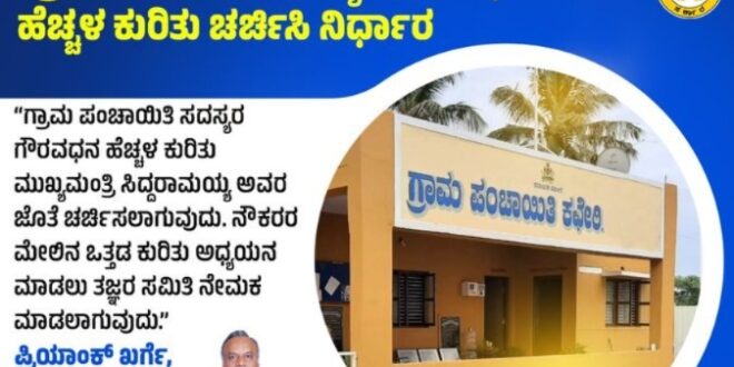 ಗ್ರಾಮ ಪಂಚಾಯಿತಿ ಸದಸ್ಯರ ಗೌರವಧನ ಹೆಚ್ಚಳ ಕುರಿತು ಮುಖ್ಯಮಂತ್ರಿ ಸಿದ್ದರಾಮಯ್ಯ ಅವರ ಜೊತೆ ಚರ್ಚಿಸಲಾಗುವುದು ಎಂದು ಸಚಿವರು ಹೇಳಿದ್ದಾರೆ.