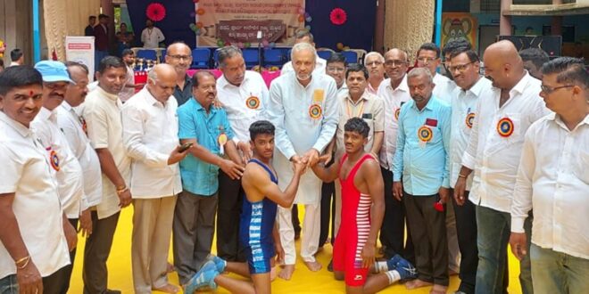 ಖಾನಾಪುರ: ಪಟ್ಟಣ ಹೊರವಲಯದ ಶಾಂತಿನಿಕೇತನ ಪಿಯು ಕಾಲೇಜಿನ ಆವರಣದಲ್ಲಿ ಶಾಲಾ ಶಿಕ್ಷಣ ಮತ್ತು ಸಾಕ್ಷರತಾ ಇಲಾಖೆ ಮಂಗಳವಾರ ಆಯೋಜಿಸಿದ್ದ ಪದವಿ ಪೂರ್ವ ಕಾಲೇಜುಗಳ ರಾಜ್ಯಮಟ್ಟದ ಕುಸ್ತಿ ಪಂದ್ಯಾವಳಿಗೆ ಸಂಸದ ವಿಶ್ವೇಶ್ವರ ಹೆಗಡೆ ಕಾಗೇರಿ ಚಾಲನೆ ನೀಡಿದರು.