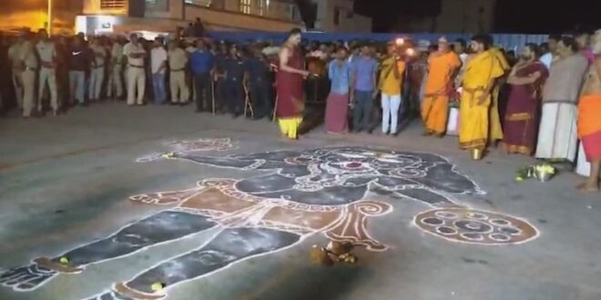 ಮೈಸೂರು: ದಕ್ಷಿಣಿ ಕಾಶಿ ನಂಜನಗೂಡಿನ ಶ್ರೀಕಂಠೇಶ್ವರ ದೇವಾಲಯದ ವತಿಯಿಂದ ಪಟ್ಟಣದ ರಾಕ್ಷಸ ಮಂಟಪದ ಬಳಿ ಅಂಧಕಾಸುರ ಸಂಹಾರ ಧಾರ್ಮಿಕ ಕಾರ್ಯಕ್ರಮ ನಡೆಯಿತು. ಇಲ್ಲಿ ಅಂಧಕಾಸುರ ರಾಕ್ಷಸನನ್ನ ಹೋಲುವ ರಾಕ್ಷಸನನ ಭಾವಚಿತ್ರವನ್ನ ರಂಗೋಲಿಯಲ್ಲಿ ಬಿಡಿಸಿ ಉತ್ಸವ ಮೂರ್ತಿಗಳನ್ನು ತಂದು ಪೂಜೆ ಮಾಡಲಾಯಿತು.