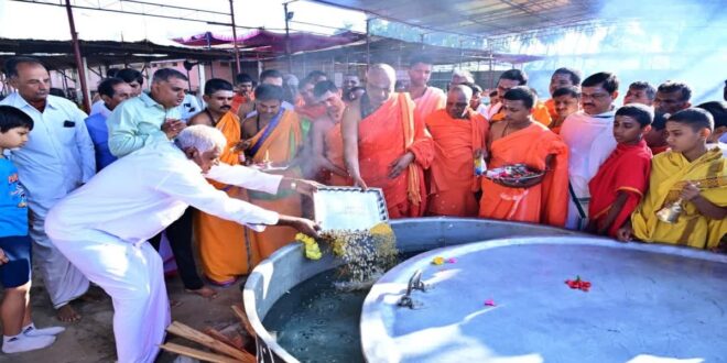 ಮೈಸೂರು: ಐತಿಹಾಸಿಕ ಸುತ್ತೂರು ಜಾತ್ರಾ ಮಹೋತ್ಸವದ ಹಿನ್ನೆಲೆಯಲ್ಲಿ ಮಹಾ ದಾಸೋಹಕ್ಕೆ ಸುತ್ತೂರು ಶ್ರೀಗಳು ಶನಿವಾರ ಚಾಲನೆ ನೀಡಿದರು. ಬೃಹತ್ ಅಡುಗೆ ಮನೆಯಲ್ಲಿ ಅಡುಗೆ ಒಲೆಗಳಿಗೆ ಪೂಜೆ ಸಲ್ಲಿಸಿ, ದೊಡ್ಡ ದೊಡ್ಡ ಪಾತ್ರೆಗಳಿಗೆ ಅಡುಗೆ ಪದಾರ್ಥ ಹಾಕುವ ಮೂಲಕ ಚಾಲನೆ ನೀಡಲಾಯಿತು. ವಿಶೇಷವೆಂದ್ರೆ ದೊಡ್ಡ ದೊಡ್ಡ ಅಡುಗೆ ಒಲೆಗಳಿಗೆ ಹಚ್ಚುವ ಬೆಂಕಿ ಒಂದು ವಾರಗಳ ಕಾಲ ಆರದೇ ಇರುವುದು ತ್ರಿಕಾಲ ಮಹಾ ದಾಸೋಹದ ವಿಶೇಷ.