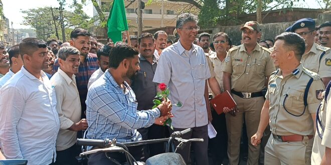 ಗುಲಾಬಿ ಹೂವು ನೀಡಿ ಹೆಲ್ಮೆಟ್ ಧರಿಸುವಂತೆ ವಿನಂತಿ