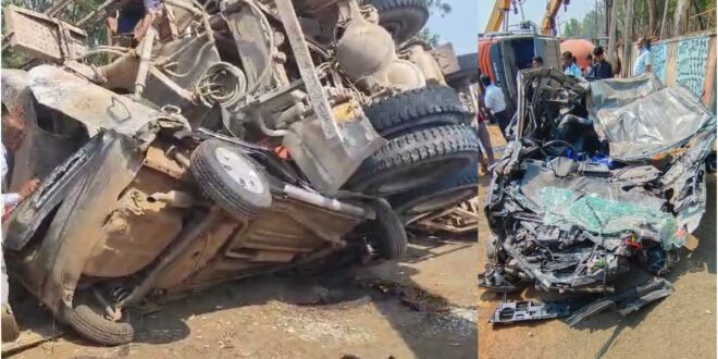 ಕಾರಿನ ಮೇಲೆ ಬಿದ್ದ ಕಾಂಕ್ರೀಟ್ ಮಿಕ್ಸರ್ ವಾಹನ