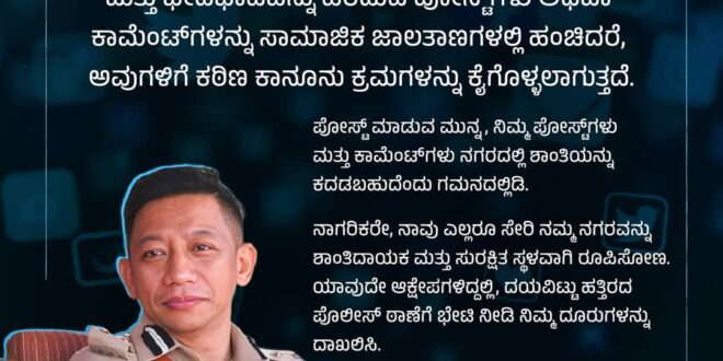 ಪೋಸ್ಟ್ ಮಾಡುವ ಮುನ್ನ, ನಿಮ್ಮ ಪೋಸ್ಟ್ಗಳು ಮತ್ತು ಕಾಮೆಂಟ್ಗಳು ನಗರದಲ್ಲಿ ಶಾಂತಿಯನ್ನು ಕದಡಬಹುದೆಂದು ಗಮನದಲ್ಲಿಡಿ.