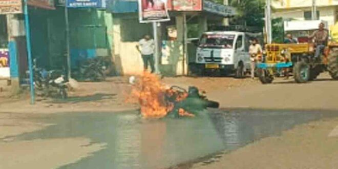 ಚಲಿಸುತ್ತಿದ್ದ ಬೈಕನಲ್ಲಿ ಕಾಣಿಸಿಕೊಂಡ ಬೆಂಕಿ, ತಪ್ಪಿದ ದುರಂತ…ಸ್ಥಳೀಯ ನೀರಿನ‌ ಟ್ಯಾಂಕ್ ಬಳಸಿ ಬೆಂಕಿ ನಂದಿಸಿದ ಜನ.