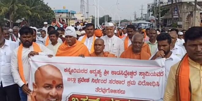 ಕನ್ನೇರಿ ಶ್ರೀಗಳು ಪಾಲ್ಗೊಳ್ಳಬೇಕಿತ್ತು. ಜಿಲ್ಲಾ ಪ್ರವೇಶ ನಿರ್ಬಂಧ ಹಿನ್ನೆಲೆ ಭಕ್ತರು, ಬೆಂಬಲಿಗರು ಪ್ರತಿಭಟನೆ ನಡೆಸಿದರು.