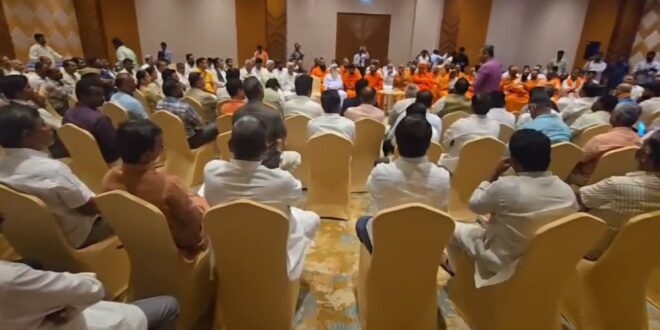 ಬೆಳಗಾವಿ: ಕನೇರಿಯ ಕಾಡಸಿದ್ದೇಶ್ವರ ಮಠದ ಅದೃಶಕಾಡಸಿದ್ದೇಶ್ವರ ಸ್ವಾಮೀಜಿ ಅವರಿಗೆ ವಿಜಯಪುರ, ಬಾಗಲಕೋಟೆ ಜಿಲ್ಲೆಗಳಿಗೆ ನಿರ್ಬಂಧ ವಿಧಿಸಿದ್ದನ್ನು ಖಂಡಿಸಿ ಇಂದು ಬೆಳಗಾವಿ ಹೊರ ವಲಯದ ಖಾಸಗಿ ಹೋಟೆಲ್ ನಲ್ಲಿ ಹಿಂದೂ ಮುಖಂಡರು ಮಹತ್ವದ ಸಭೆ ನಡೆಸಿದರು.