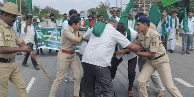 ಕಬ್ಬಿನ ಬೆಲೆ ಹೆಚ್ಚಳಕ್ಕೆ ಆಗ್ರಹಿಸಿ ಚಾಮರಾಜನಗರದಲ್ಲಿ ಪ್ರತಿಭಟನೆ: ಪೊಲೀಸರು – ರೈತರ ನಡುವೆ ಜಟಾಪಟಿ