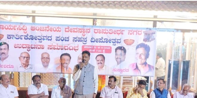 ಅವರು ಶನಿವಾರ ಬೆಳಗಾವಿ ರಾಮತೀರ್ಥನಗರದ ಶ್ರೀ ಕಾರ್ಯಸಿದ್ಧಿ ಆಂಜನೇಯಸ್ವಾಮಿ ದೇವಸ್ಥಾನದಲ್ಲಿ ಕಾರ್ತಿಕೋತ್ಸವ ನಿಮಿತ್ತ ಸಂಜೆ ಜರುಗಿದ ಪಂಚ ಸಹಸ್ರ ದೀಪೋತ್ಸವ ಕಾರ್ಯಕ್ರಮದಲ್ಲಿ ಮುಖ್ಯ ಅತಿಥಿಯಾಗಿ ಪಾಲ್ಗೊಂಡು ಗದ್ದುಗೆಗೆ ಪೂಜೆ ಸಲ್ಲಿಸಿ ರಾಷ್ಟ್ರಪ್ರಶಸ್ತಿ ಪುರಸ್ಕ್ರತ ನಿವ್ರತ್ತ ಘಟಕಾಧಿಕಾರಿ ಬಸಪ್ಪಾ ಉರಬಿನಹಟ್ಟಿ ಅವರನ್ನು ಸನ್ಮಾನಿಸಿ ಮಾತನಾಡಿದರು.