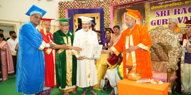 ರಾಯಚೂರು: ಮಂತ್ರಾಲಯದಲ್ಲಿ ರಾಯರ ಗುರುವೈಭವೋತ್ಸವ ಸಂಭ್ರಮ ಮನೆಮಾಡಿದ್ದು, ಮಠದ ಕಾರ್ಯಕ್ರಮದಲ್ಲಿ ಅಮೆರಿಕದ ಫ್ಲೋರಿಡಾ ವಿವಿಯ ಗೌರವ ಡಾಕ್ಟರೇಟ್ ಪದವಿಗಳನ್ನ ಪ್ರದಾನ ಮಾಡಲಾಯಿತು. ಹಿರಿಯ ನಟ ರಾಘವೇಂದ್ರ ರಾಜಕುಮಾರ್ ಹಾಗೂ ಇತರ ಗಣ್ಯರಿಗೆ ವಿವಿಯ ಗೌರವ ಡಾಕ್ಟರೇಟ್ ನೀಡಿ ಗೌರವಿಸಲಾಯಿತು.