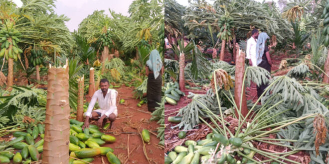 ಜಿಲ್ಲೆಯ ಕೂಡ್ಲಿಗಿ ತಾಲೂಕಿನ ಅಮರದೇವರಗುಡ್ಡ ಗ್ರಾಮದಲ್ಲಿ ಮಳೆಗೆ ಪಪ್ಪಾಯ, ಅಡಿಕೆ ಸೇರಿ ತೋಟಗಾರಿಕೆ ಬೆಳೆ ಸಂಪೂರ್ಣ ನಾಶವಾಗಿದೆ. ಕಟಾವಿಗೆ ಬಂದಿದ್ದ ಪಪ್ಪಾಯ ಬೆಳೆ ಕಳೆದುಕೊಂಡು ರೈತರು ಕಂಗಾಲಾಗಿದ್ದಾರೆ. ರೈತ ಬೀರಪ್ಪ ತನ್ನ 4 ಎಕರೆ ಜಮೀನಿನಲ್ಲಿ, ಲಕ್ಷಾಂತರ ಹಣ ಖರ್ಚು ಮಾಡಿ ಪಪ್ಪಾಯ ಬೆಳೆದಿದ್ದ. ಇದೀಗ ಲಕ್ಷಾಂತರ ಮೌಲ್ಯದ ಬೆಳೆ ಕಳೆದುಕೊಂಡಿರುವ ರೈತ ದಿಕ್ಕು ತೋಚದಂತಾಗಿದ್ದಾನೆ.